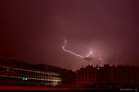 Ni une ni deux, je saute hors de mon lit, attrape de quoi m’habiller et file sur le balcon exposé Nord-Est. Des flashs font leur apparition. Un impact ramifié me décide à installer en vitesse le matériel photo : le Bestiau sur trépied, le déclencheur souple à la main. Batterie bien chargée, et carte mémoire vide (j’ai du précipitamment changer la carte de 1 Go qui était pleine pour une de 4 Go totalement vide). Je décide de photographier en mode RAW. Et ce sont de loin les meilleurs clichés orageux que j’ai jamais obtenu avec un appareil photo numérique.