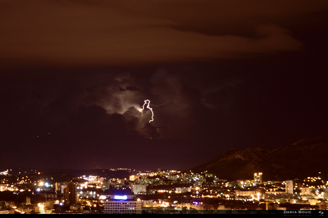 Faut dire que le contexte nuageux indiquait une forte instabilité de l’atmosphère. La partie sombre sur le centre des tourelles cumuliformes correspond à l’ombre d’un cumulonimbus en train de se former. Je m’habille, prend apn, trépied, de quoi casser la graine, et direction Notre Dame de la Garde pour assister au déplacement des cellules orageuses sur la ville. Las ! J’arriverai trop tard, et les orages auront fini d’arroser la ville. Je peu toutefois assister à la fuite de la ligne vers l’Est, vue de droite.
