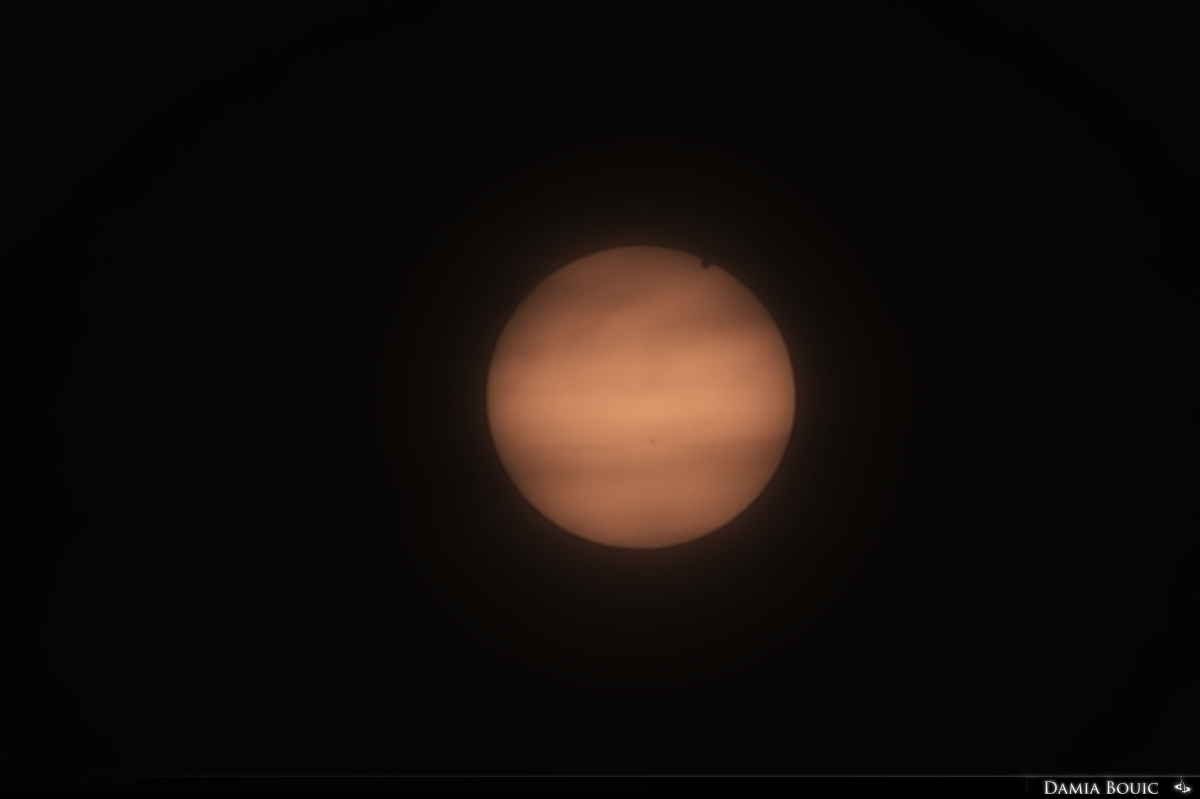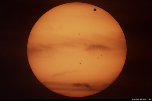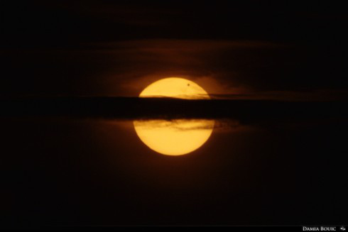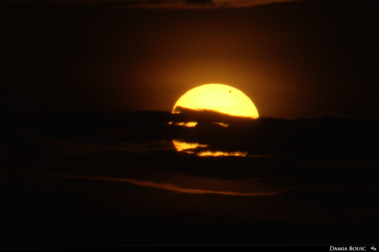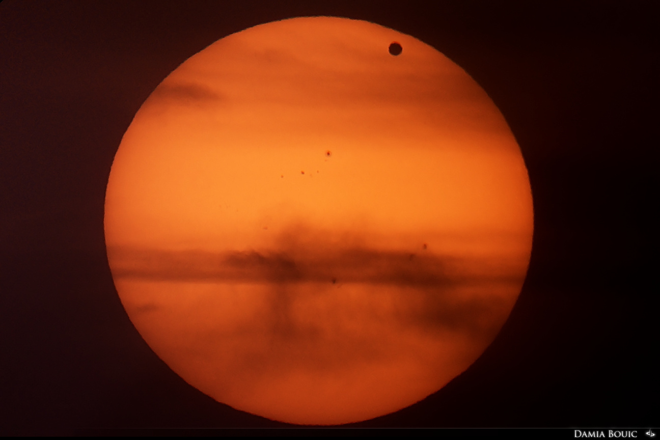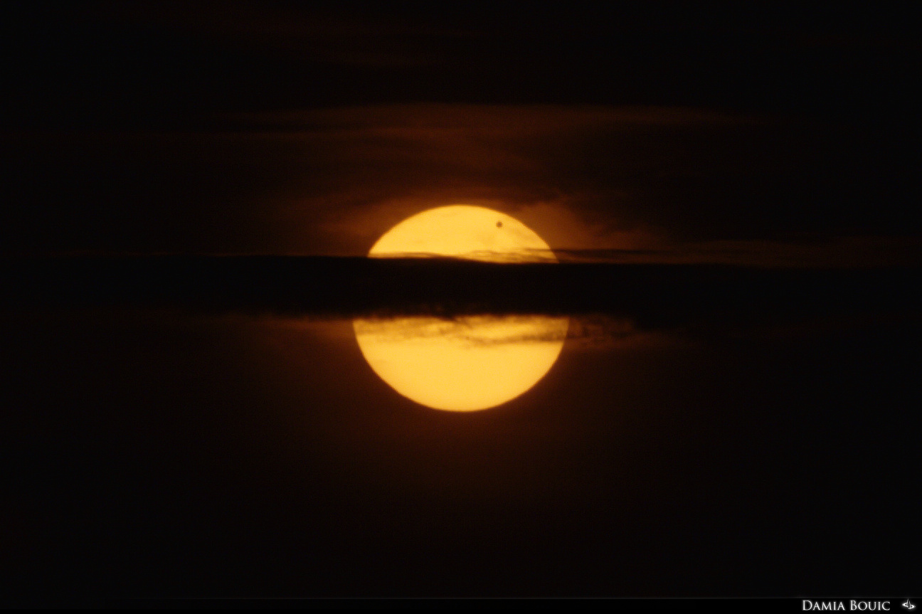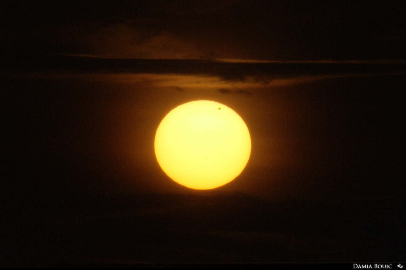 Et puis… Le voici. Sur l’image de droite, tentez de distinguer un petit point noir sur le Soleil à peine levé : c’est Vénus.
