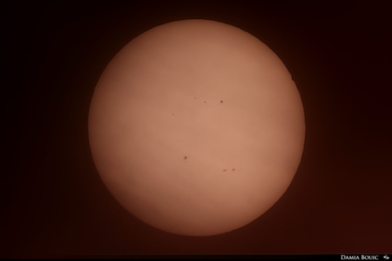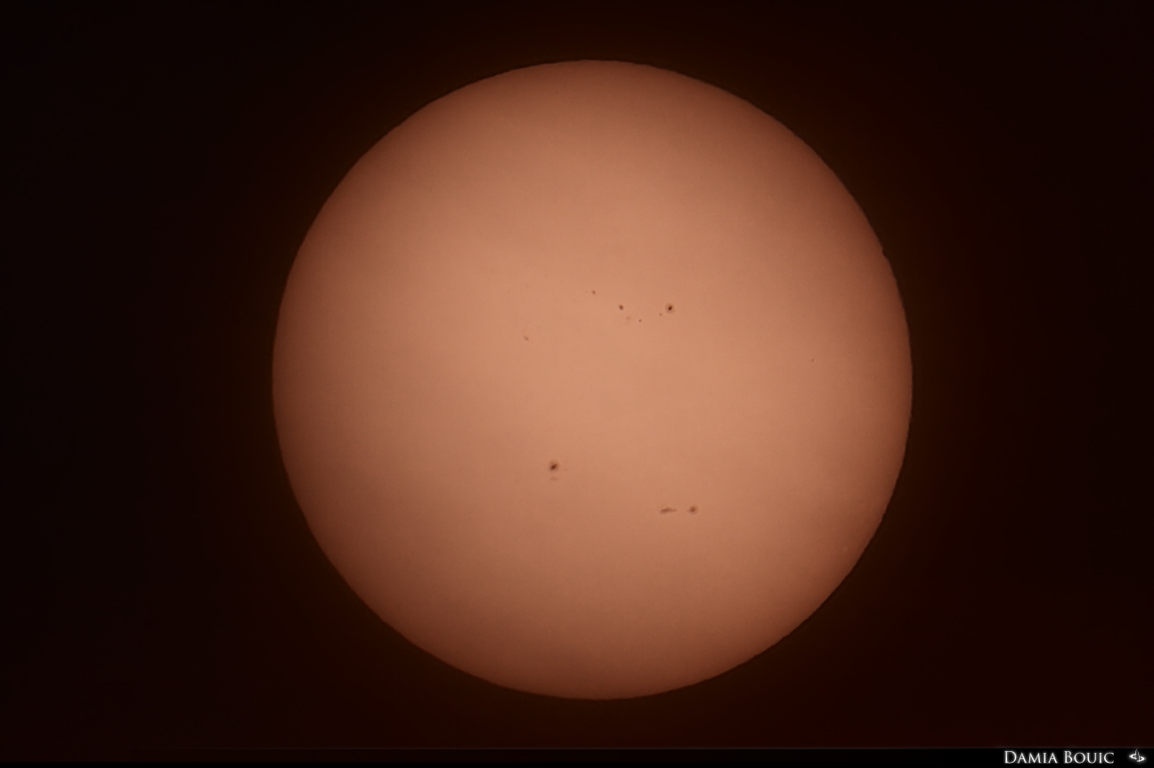 Et puis, j’improvise quelque chose : faire de la prise de vue directement au foyer de mon télescope, à main levée. Le résultat est plus que correct ! Les nuages rajoutent une esthétique certaine à ce disque solaire.