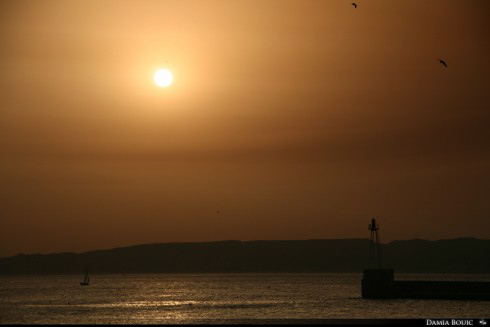 Le coucher du Soleil, vu depuis les Catalans. Tandis que la visibilité est excellente (Côte Bleue visible jusqu’à l’horizon), le ciel est lui assez « brumeux ». Point de nuages ici. Les poussières, et puis aussi sans doute les cendres de l’incendie espagnol.