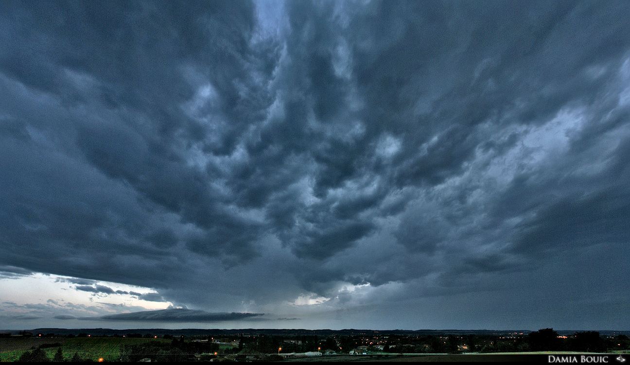 Panorama complet sur l’orage. Le Sud est à gauche, l’Ouest au centre et le Nord à droite. La zone de précipitations nous frôlera et concernera plus Toulouse.