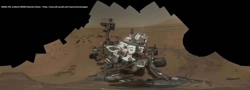 Au Sol 84 de la mission, Curiosity a tendu sa caméra couleur située sur son bras afin de réaliser un autoportrait, sur fond de paysage martien. Il en résulte l’une des vues les plus incroyable que j’aie jamais pu assembler. Et chose excellente : aucun effet de paralaxe entre chaque image, d’où une « facilité » d’assemblage très bonne.