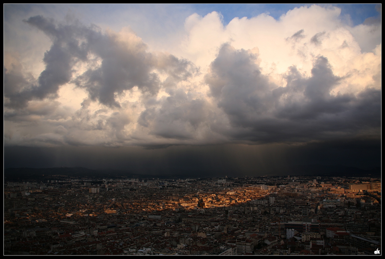 Des rayons de Soleil filtrent au travers des nuages, se projettent au travers des précipitations, offrant un beau jeu de lumière. A droite, la cathédrale de la Major, dont les coupoles encore humides brillent au Soleil (à l’arrière, les docks de Marseille).